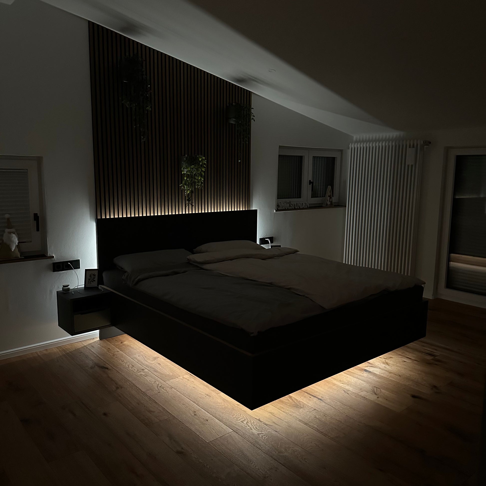 Unser Schwebebett - Comfort STABULUM - ist für diejenigen, die ein super Stabiles Möbel mit hochwertigen Materialien suchen. Dank zurückliegendem Sockel und unserem exklusiven Design mit optionaler Beleuchtung schwebt das Bett. Das Kopfteil steht nach oben über und kann demnach als Lehne genutzt werden. Die Materialstärke beträgt 28 mm. Oberflächen sind aus extrem kratzfestem HPL- Schichtstoff mit Supermatt & AntiFingerprint Oberfläche. Wir haben einige Farben und Größen zur Auswahl. Alternativ sind auch Echtholz Varianten in Eiche und Nussbaum möglich. Moderne 1 mm Kante mit filigranem Radius - Laserkante mit 0 Fugen Technologie - wasserfest dank modernster PU-Verleimung.