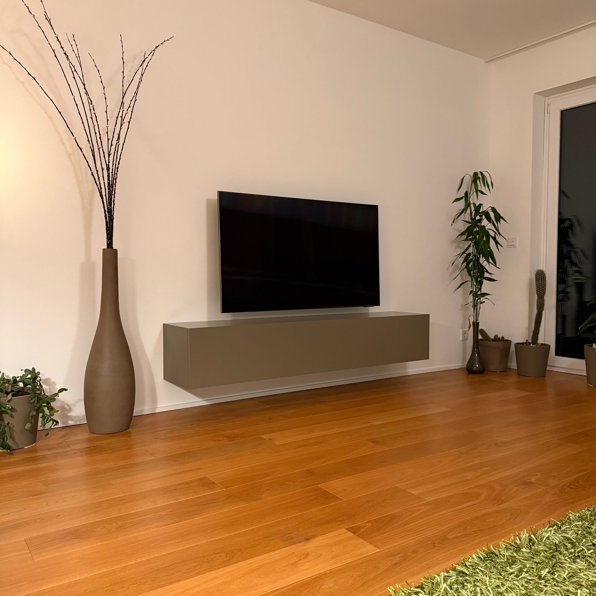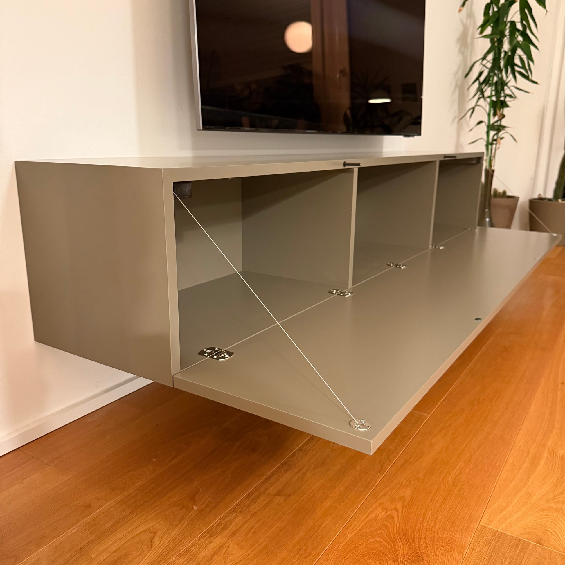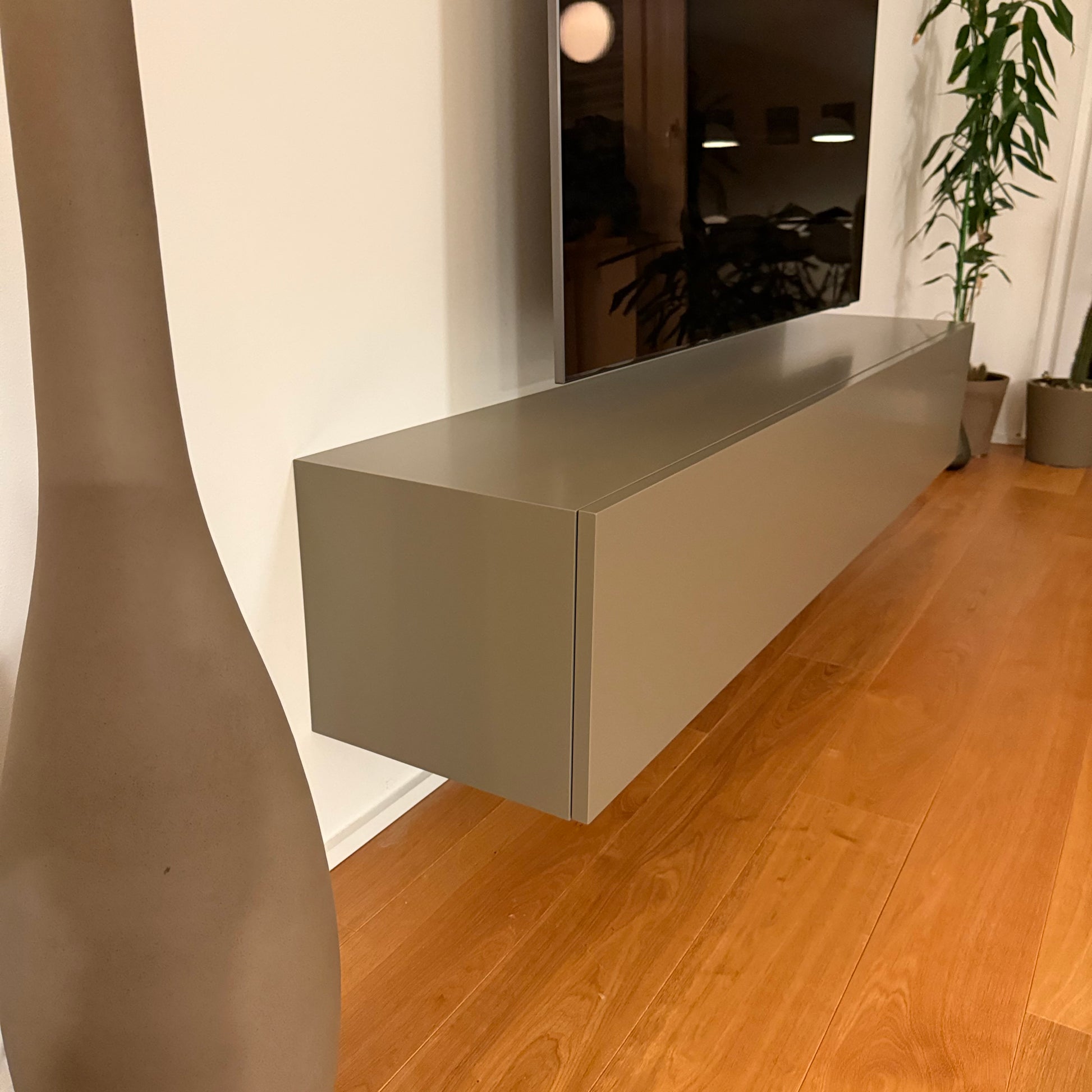 Ein minimalistisches Möbel für hohe Ansprüche im eigenen Wohnzimmer. Es bietet reichlich Stauraum, erreichbar über eine fortlaufende Frontklappe. Diese wird durch langlebige Scharniere und einem super filigranen Beschlag mit Drahtseil geführt. Die Öffnung erfolgt grifflos - push to open. Der Korpus ist hier auf Gehrung gearbeitet, sodass keine Kanten von außen sichtbar sind. Die Oberfläche wird im Farbton nach Wunsch Supermatt oder Hochglanz lackiert. ( RAL, NCS, F&B ) Moderne 1 mm Kante mit filigranem Radius - Laserkante mit 0 Fugen Technologie - wasserfest dank modernster PU-Verleimung.